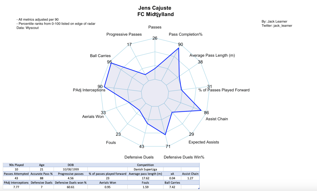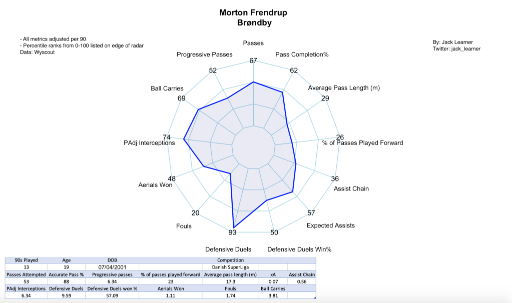 Denmark, not only the home of the pastry but also to some of the world’s most exciting young talent. With the increase in mainstream attention that Scandinavian football has been getting in recent years with their incredible amount of young talent being produced, I thought it would be a perfect opportunity to take a close look at some of the Danish SuperLiga’s most exciting Under 21 stars. I had little knowledge of the outlook of the league coming into it. After doing some research I found some amazing analysis work done by the guys at Statsbomb that broke down how the SuperLiga compares to the EPL and German Bundesliga. I thought I would share what they found in order to give some useful background on the league and how this may affect the evaluation of the players I have reviewed. The analysis showed that the SuperLiga is a much more balanced league with the disparity between the top and bottom teams not being as large as the EPL and the German Bundesliga. This means most of the games in the SuperLiga are going to be even affairs with both teams going for it. The style of play between all three leagues are roughly similar, but the SuperLiga likes to create more from wide areas and plays slightly more direct than the EPL and German Bundesliga. The SuperLiga also places the largest emphasis on set pieces. When it comes to defensive pressure the SuperLiga is slightly less aggressive, this means players have more time on the ball which is something to consider. Overall the SuperLiga lines up pretty well with the EPL and German Bundesliga’s trajectory. Obviously, there is a large gap in talent but with the leagues playing similar styles it may be an easier transition for players from the SuperLiga to make that step. With all this being said, I found the Danish SuperLiga to be an incredibly unique league with balanced teams, a high level of players and teams with an interesting diversity in tactics, and most of all the ever-increasing exciting pool of young talent.