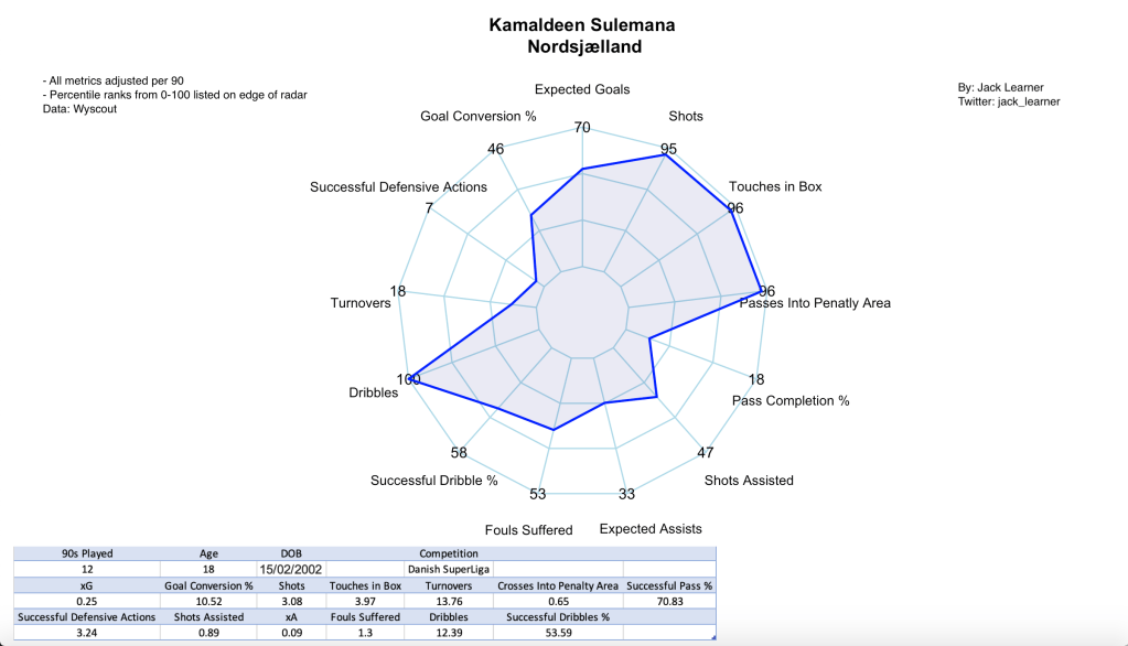 Kamaldeen is an explosive dribbler who takes space very quickly pushing his team up the pitch. At Nordsjælland he tends to play either LW or as a SS, this leaves him space to drive into as well as make runs in behind. He has incredibly quick feet with great close control, using his quick feet to get out of tight areas and then exploding into the space. He uses his frame incredibly well, he is stocky and strong (especially for his age). He gets his body in front of the defender preventing them from making a tackle or forcing them to foul. His ability to hold and keep the ball in tight spaces then turn and burst away leaving the defender for dead is a common trait among the world’s best wingers, which Kamaldeen certainly possesses and utilizes often. He has a strong shot which he certainly isn’t afraid to use (more on that in a little). He is the heartbeat of everything that Nordsjælland does, dazzling with the unthinkable and taking defenders lives for fun.