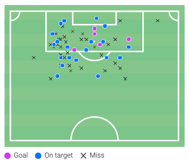 While his goalscoring is creating the headlines, he is also in the 95th percentile in expected assists. He is not only creating for himself at a high rate but is creating for his teammates at an even higher rate. As I mentioned earlier, his ability in and around the opposition’s box is what sets him apart. This also goes for his ability to facilitate chances for his teammates to exploit. He has the vision to slip passes into the small gaps combined with the perfect weight of pass to set his teammates up for shooting opportunities.